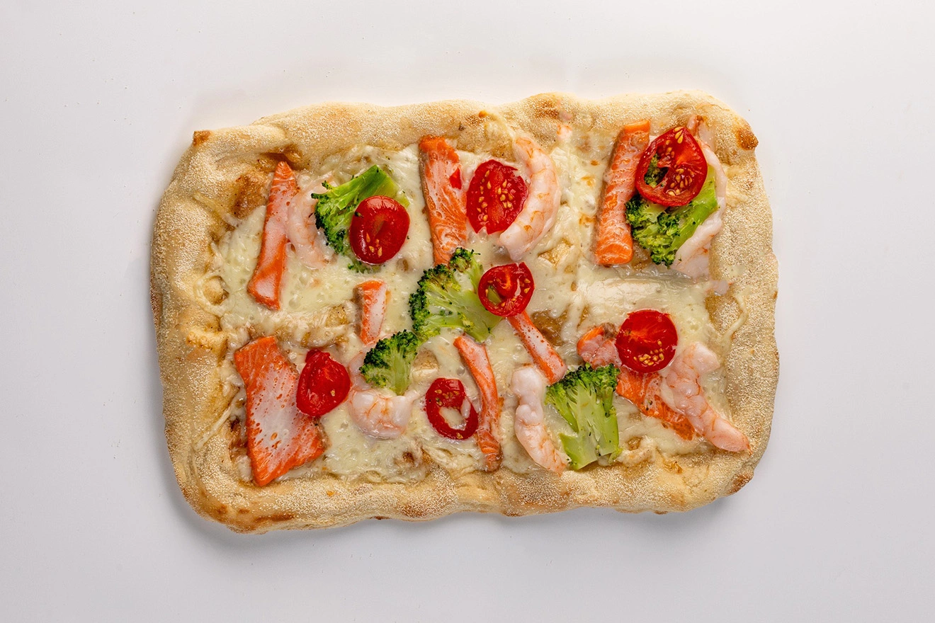 Корж для пиццы (мука из мягких сортов пшеницы типа «00», закваска пшеничная (мука из мягких сортов пшеницы типа «О», прошедшая процесс натурального брожения и ферментации), масло подсолнечное рафинированное дезодорированное, вода питьевая, соль пищевая, дрожжи хлебопекарные сушеные), сыр "Моцарелла" м. д. ж. в сухом веществе 40% (молоко нормализованное пастеризованное, соль пищевая, уплотнитель - хлорид кальция, бактериальная закваска термофильных и мезофильных микроорганизмов, молокосвертывающий фермент микробного происхождения), лимонно-горчичный соус (масло подсолнечное рафинированное дезодорированное, горчица зернистая (вода питьевая, семена горчицы, спиртовой уксус, винный уксус, соль пищевая, уксус из хереса, куркума), сок лимона прямого отжима, цедра лимона, сахар, соль пищевая, перец черный молотый), форель радужная филе, креветки белоногие, капуста брокколи свежая, томаты (черри) свежие.