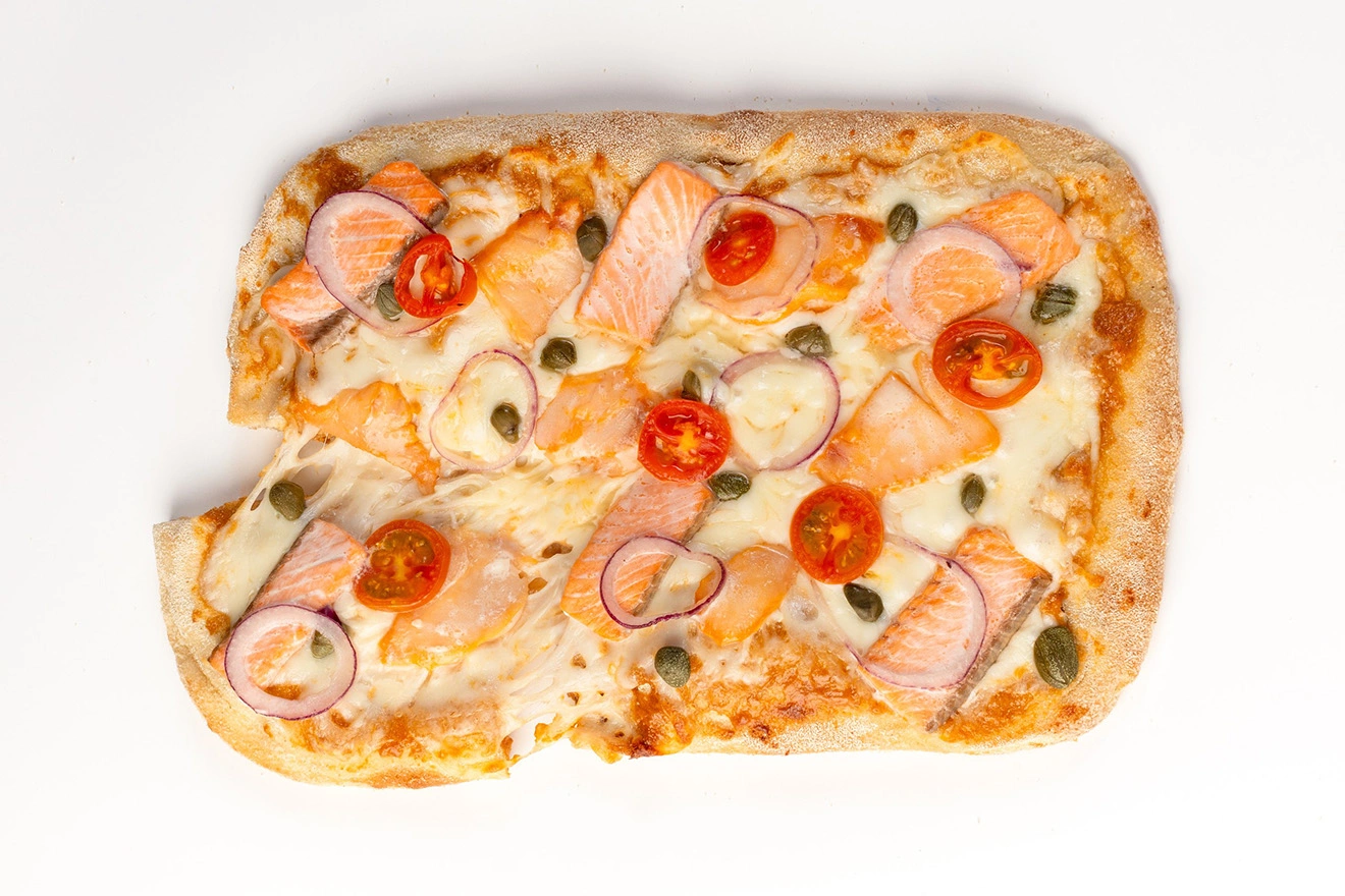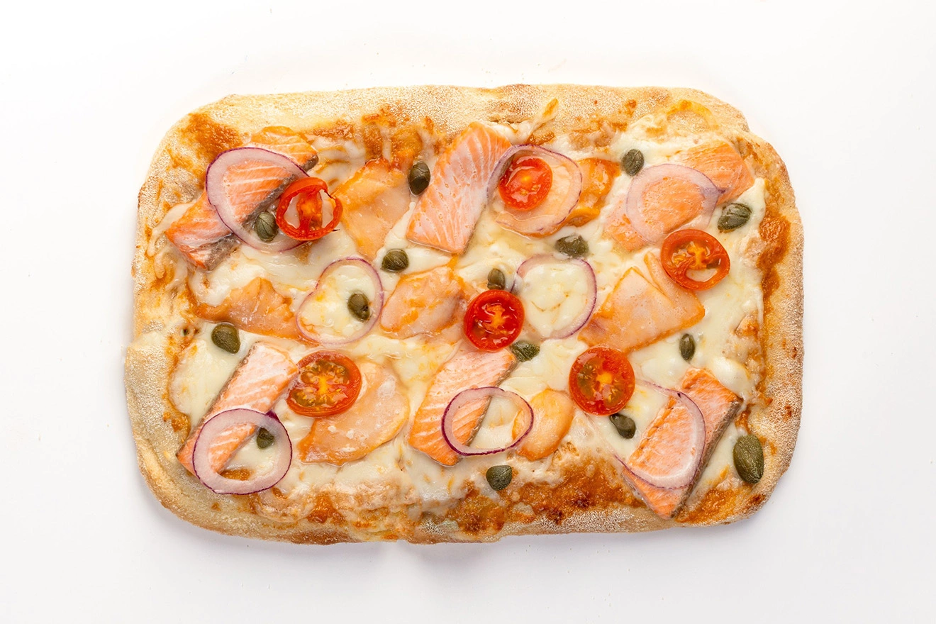 корж для пиццы (мука пшеничная высший сорт, вода питьевая, мука рисовая, мука из бобовых, дрожжи х/п инстантные (дрожжи, эмульгатор, антиокислитель; аскорбиновая кислота), крупа манная, масло подсолнечное, соль пищевая, сахар), сыр моцарелла м.д.ж в сухом веществе 40% (пастеризованное молоко, соль пищевая, термофильная бактериальная закваска, молокосвертывающий ферментный препарат микробиального происхождения), соус унаги (унаги (соевый соус (вода питьевая, соевые бобы, пшеница, соль пищевая), питьевая вода, сахар, натуральные пряности и их экстракты, овощи сушеные (чеснок, лук, сельдерей, томат, имбирь, паприка), мед натуральный, уксус винный, карамелизированный сахарный сироп, ароматизаторы, гидролизат растительного белка (кукурузы)), масло подсолнечное рафинированное дезодорированное, сливки питьевые 20%, сыр крем чиз м.д.ж. в сухом веществе 70% (сливки нормализованные пастеризованные, соль пищевая, мезофильные бактериальные закваски)), форель радужная, масляная рыба, помидоры черри, лук красный, каперсы (каперсы, уксус пищевой 9%, вода питьевая, соль пищевая).