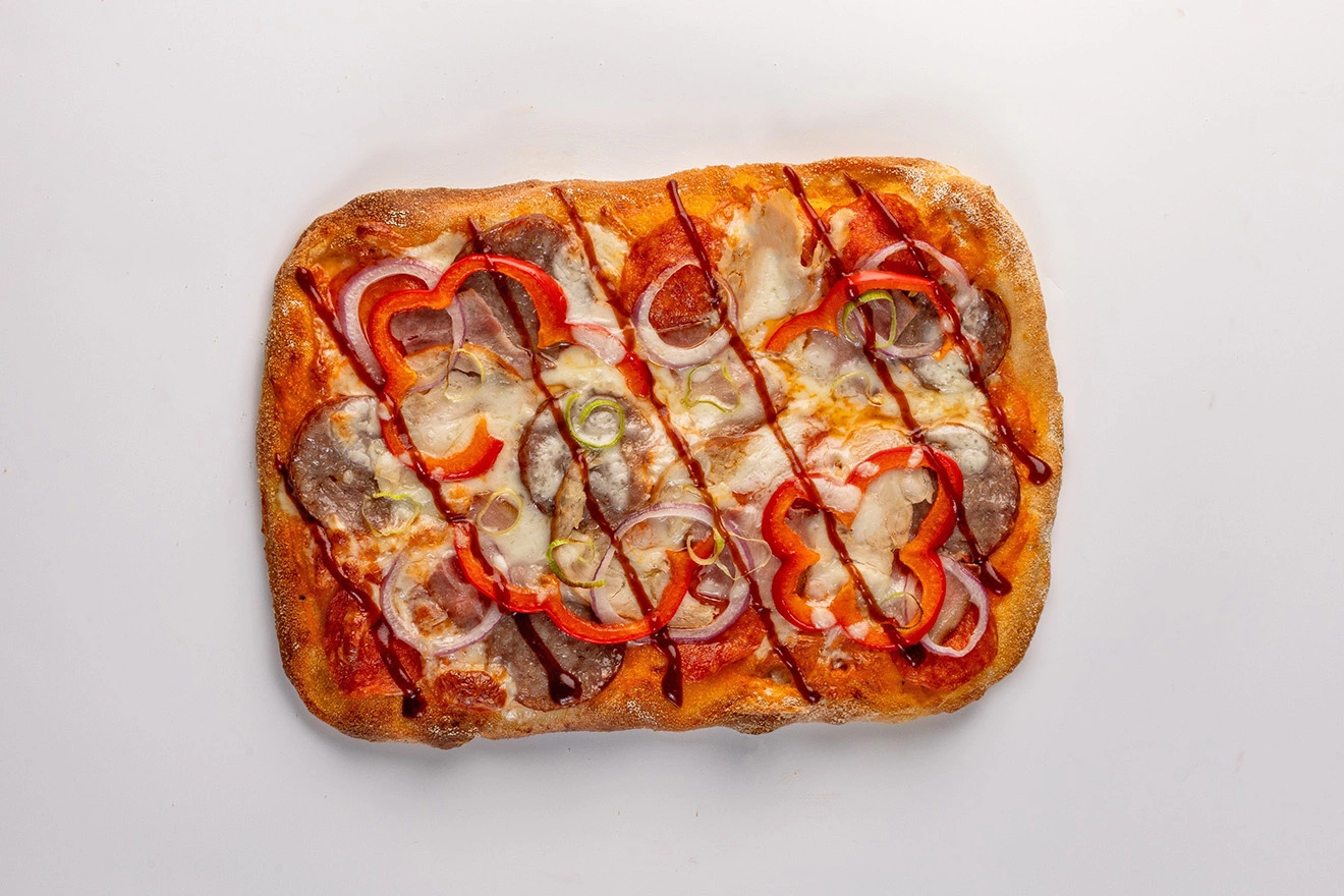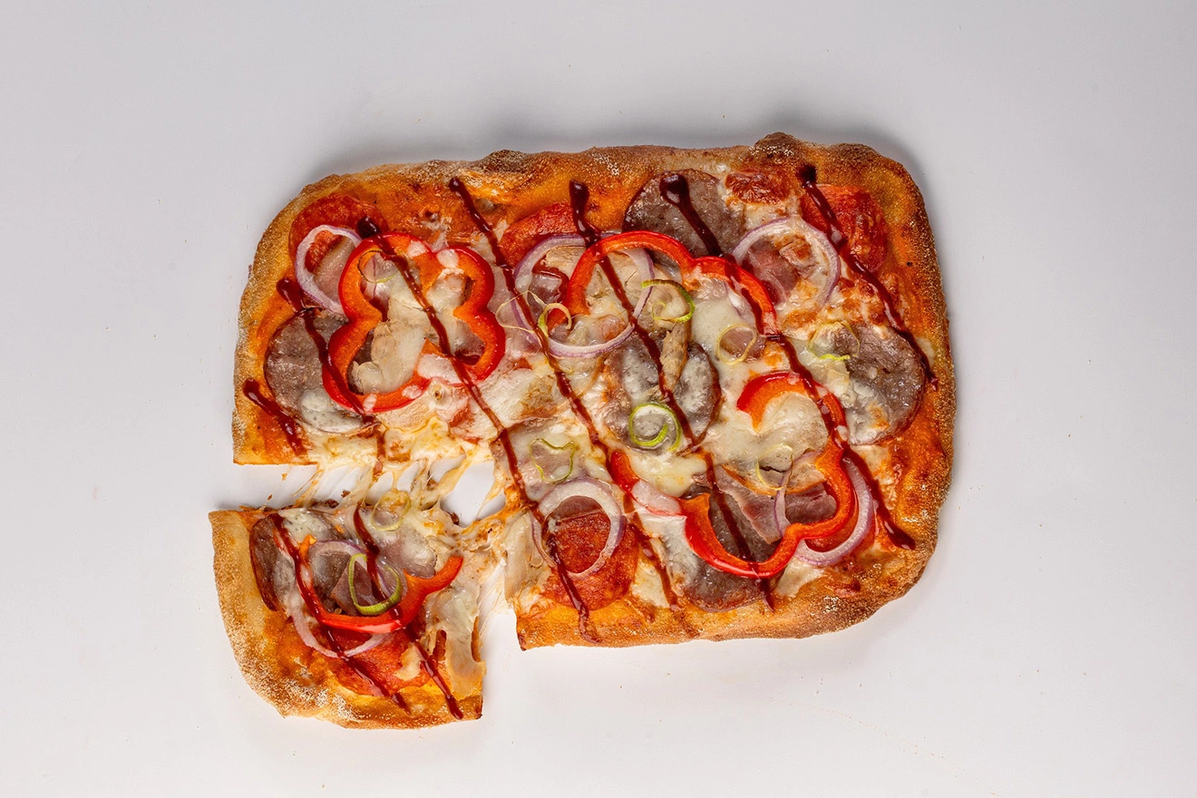 Корж для пиццы (мука из мягких сортов пшеницы типа «00», закваска пшеничная (мука из мягких сортов пшеницы типа «О», прошедшая процесс натурального брожения и ферментации), масло подсолнечное рафинированное дезодорированное, вода питьевая, соль пищевая, дрожжи хлебопекарные), сыр "Моцарелла" м .д. ж. в сухом веществе 40% (Молоко пастеризованное, соль пищевая, термофильная бактериальная закваска, молокосвертывающий ферментный препарат микробного происхождения), соус Барбекю (сыр крем чиз м. д. ж. в сухом веществе 70% (сливки нормализованные пастеризованные, соль пищевая, мезофильные бактериальные закваски), масло подсолнечное рафинированное дезодорированное, соус барбекю (Смесь растительных масел (рапсовое, подсолнечное), натуральные пряности (чеснок, паприка, перец черный, семена горчицы, орегано, кориандр, перец белый), экстракты (чеснок, паприка, перец черный, горчица, орегано, кориандр, перец белый), овощи сушеные (чеснок, паприка), соль пищевая, сахар), колбаса полусухая "Пепперони" (свинина, говядина, шпик, соль пищевая, специи молотые (паприка, перец душистый, перец черный, кориандр, тмин), экстракт (паприка, мускатный орех), растительные волокна (пшеничные, цитрусовые), антиокислитель (изоаскорбат натрия, аскорбиновая кислота), мальтодекстрин, ароматизатор натуральный «мускатный орех», масло подсолнечное рафинированное дезодорированное, краситель (красный рисовый), стартовые культуры), бекон сырокопченый (грудинка свиная, соль пищевая, натуральные экстракты (цитрусов, розмарина, кукурузы), сироп глюкозы, стартовая культура), колбаса сервелат финский (свинина, шпик свиной, говядина, вода питьевая, соль пищевая, специи (перец черный молотый, перец душистый молотый, горчичный порошок, декстроза, экстракты пряностей (перец черный, чеснок)), буженина из курицы (филе куриное, вода питьевая, соль пищевая, сахар, чеснок гранулированный, перец черный молотый), перец болгарский свежий, лук красный свежий, лук порей свежий.