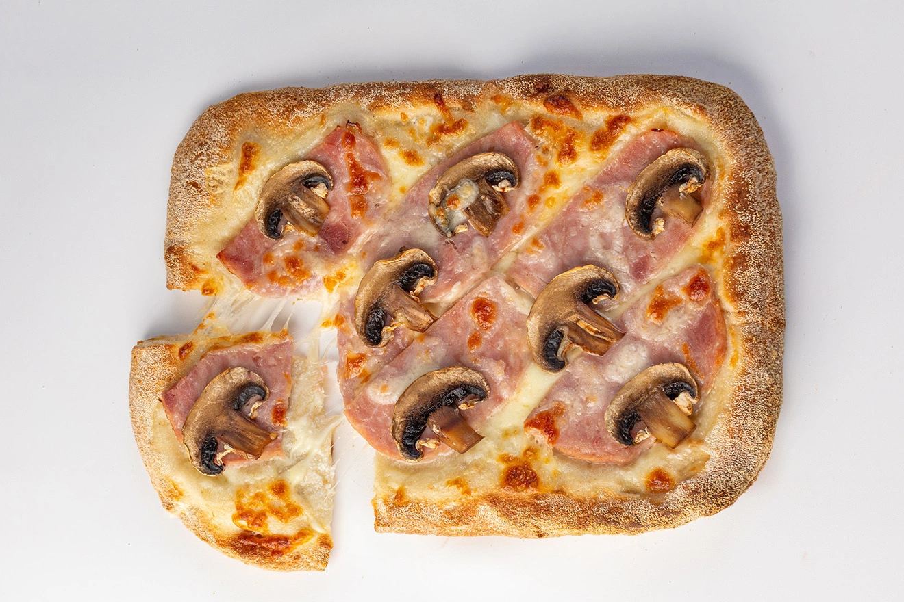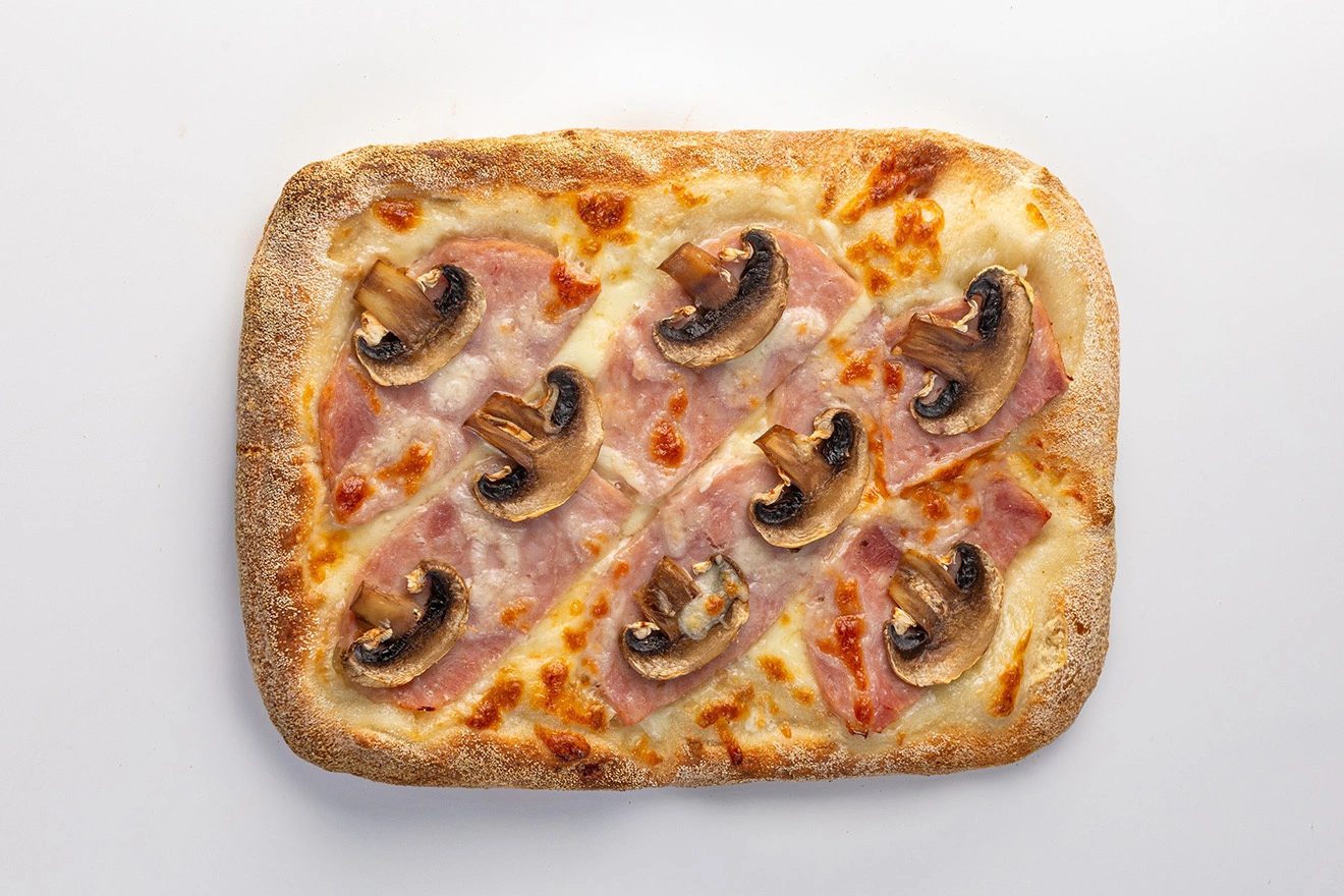 Корж для пиццы (мука из мягких сортов пшениц типа "00", закваска пшеничная, мука из мягких сортов пшениц типа "0", прошедшая процесс натурального брожения и ферментации, масло подсолнечное рафинированное дезодорированное, вода питьевая, соль пищевая, дрожжи хлебопекарные), сыр Моцарелла м.д.ж. в сухом веществе 40% (молоко пастеризованное, соль пищевая, термофильная бактериальная закваска, молосвертывающий ферментный препарат микробного происхождения), ветчина для Тостов Жамбон (свинина, вода питьевая, соль пищевая, крахмал кукурузный, экстракты фруктов (лимон, лайм, апельсин, помего)), соус (сыр мягкий Кремчиз м.д.ж. в сухом веществе 70% (сливки нормализованные пастеризованные, соль пищевая, мезофильные бактериальные закваски), масло подсолнечное рафинированное дезодорированное, сливки питьевые м.д.ж. 22% (сливки нормализованные), вода питьевая, лук репчатый сушеный жареный (лук репчатый сушеный хлопья, масло подсолнечное рафинированное дезодорированное), соль пищевая, сахар), грибы шампиньоны свежие.