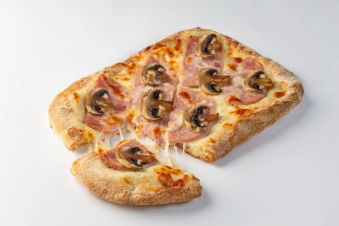 Корж для пиццы (мука из мягких сортов пшениц типа "00", закваска пшеничная, мука из мягких сортов пшениц типа "0", прошедшая процесс натурального брожения и ферментации, масло подсолнечное рафинированное дезодорированное, вода питьевая, соль пищевая, дрожжи хлебопекарные), сыр Моцарелла м.д.ж. в сухом веществе 40% (молоко пастеризованное, соль пищевая, термофильная бактериальная закваска, молосвертывающий ферментный препарат микробного происхождения), ветчина для Тостов Жамбон (свинина, вода питьевая, соль пищевая, крахмал кукурузный, экстракты фруктов (лимон, лайм, апельсин, помего)), соус (сыр мягкий Кремчиз м.д.ж. в сухом веществе 70% (сливки нормализованные пастеризованные, соль пищевая, мезофильные бактериальные закваски), масло подсолнечное рафинированное дезодорированное, сливки питьевые м.д.ж. 22% (сливки нормализованные), вода питьевая, лук репчатый сушеный жареный (лук репчатый сушеный хлопья, масло подсолнечное рафинированное дезодорированное), соль пищевая, сахар), грибы шампиньоны свежие.