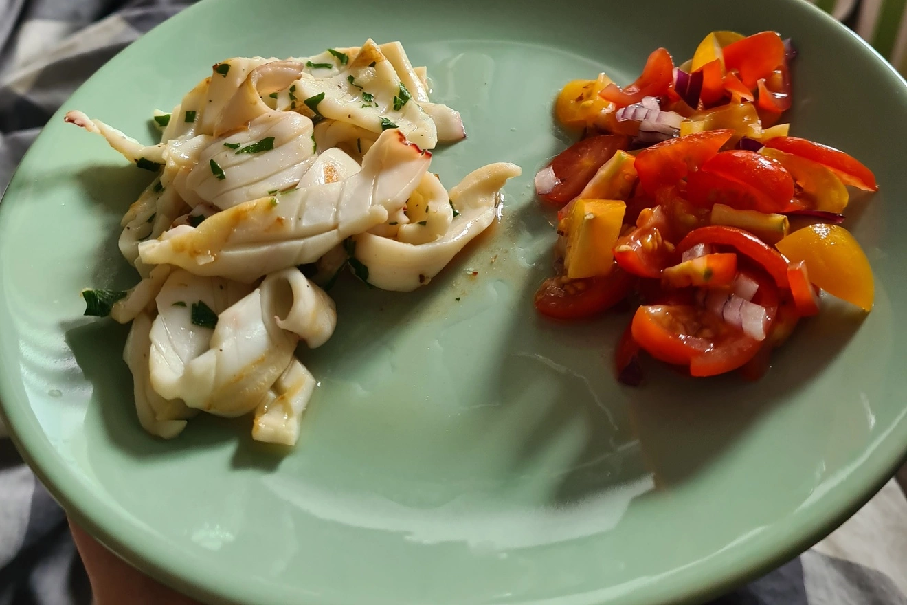 ● Филе кальмара нарезать кольцами. Обмакивать в кляр и опускать в кипящее масло. Готовить с двух сторон примерно по 20 секунд. Выкладывать на салфетку, чтобы стек лишний жир.