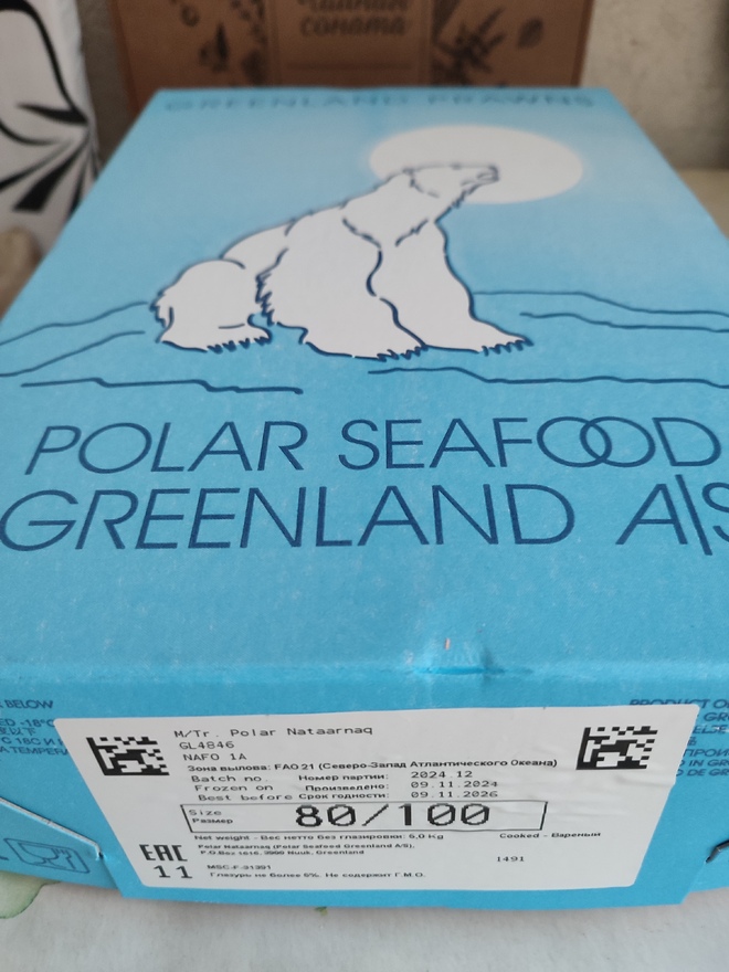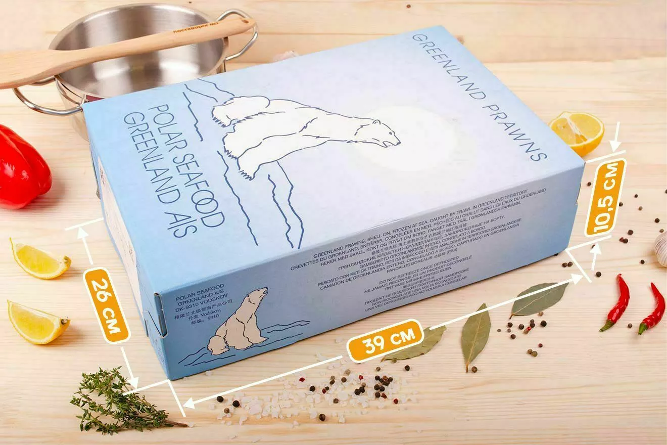 Креветка северная в/м, 80-100 шт в кг, коробка 5 кг ("коробка с медведем", Гренландия)