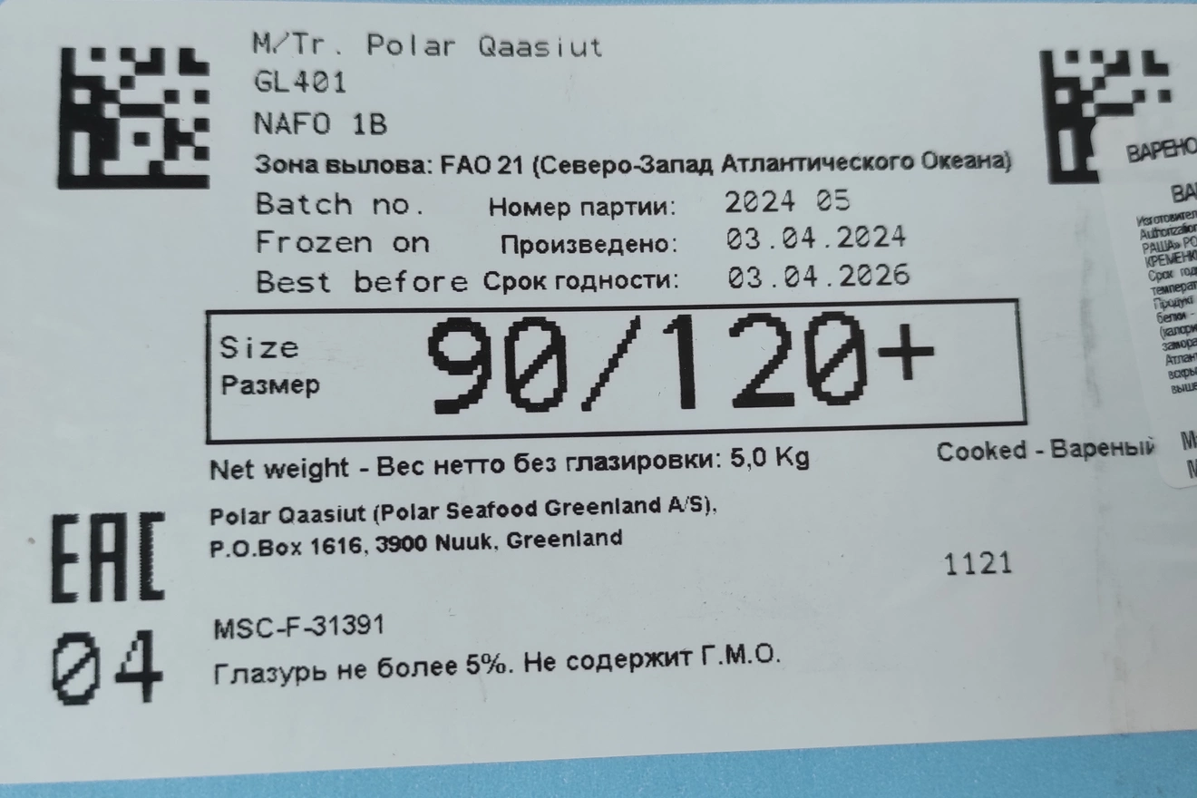 Креветки северные в/м, 90-120+ шт в кг, коробка 5 кг ("коробка с медведем", Гренландия)