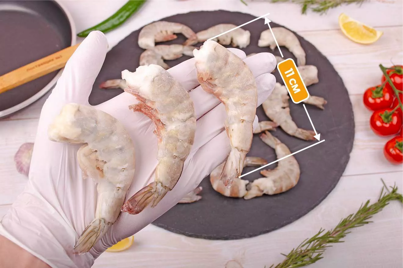 от 35 до 44 штук в 1 кг, 10-11 см длина креветки, вес 22-27 гр
