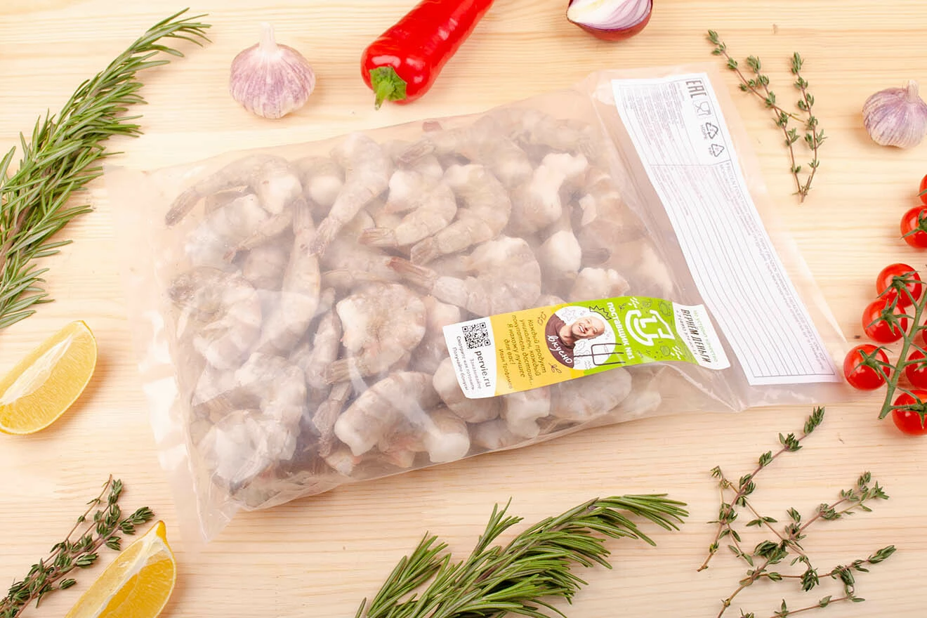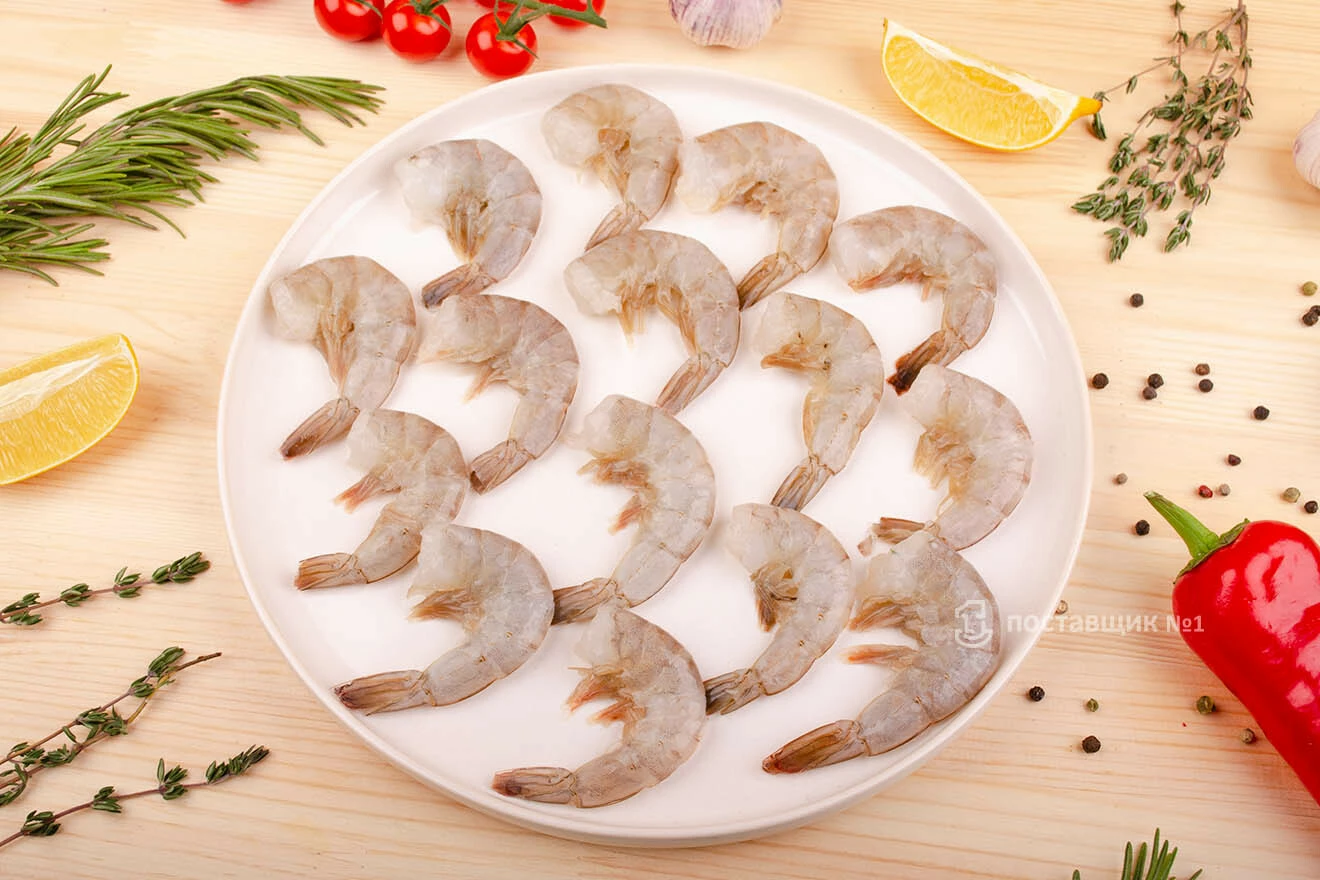 Креветки без головы, индивидуальная шоковая заморозка, глазурь не более 7%. Подходят для жарки, гриля, фритюра, варки. Морепродукт используется для приготовления шашлычков, пасты, пиццы, салатов и закусок. Насыщенный вкус и плотная структура мяса.