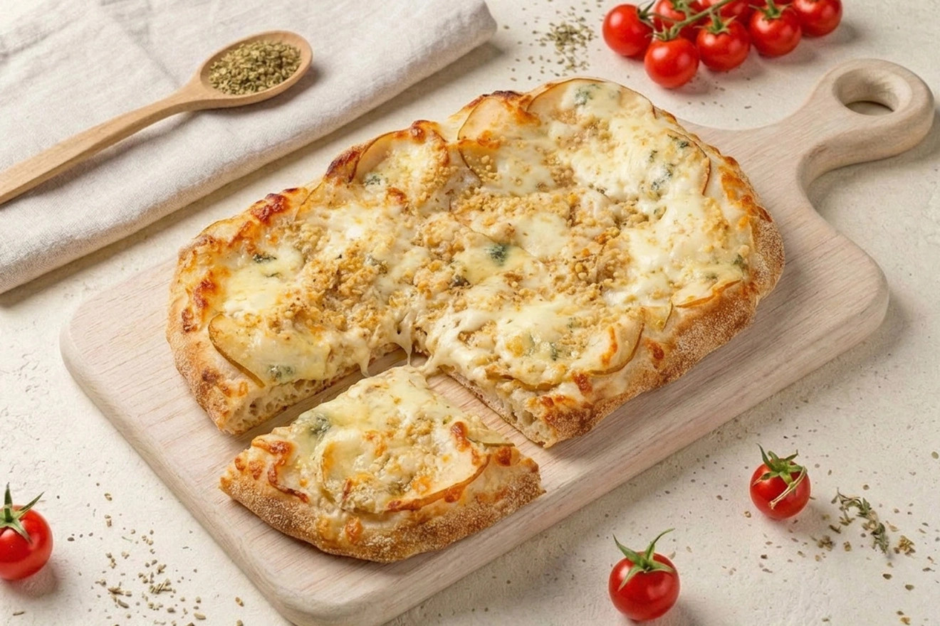 Корж для пиццы (мука из мягких сортов пшеницы типа «00», закваска пшеничная (мука из мягких сортов пшеницы типа «О», прошедшая процесс натурального брожения и ферментации), масло подсолнечное рафинированное дезодорированное, вода питьевая, соль пищевая, дрожжи хлебопекарные сушеные), сыр моцарелла м. д. ж. в сухом веществе 40% (молоко пастеризованное, соль пищевая, термофильная бактериальная закваска, молокосвертывающий ферментный препарат микробного происхождения), соус сырный (сыр мягкий Кремчиз м. д. ж. в сухом веществе 70% (сливки нормализованные пастеризованные, соль пищевая, мезофильные бактериальные закваски), масло подсолнечное рафинированное дезодорированное, приправа «Прованские травы» (соль морская пищевая, орегано, мята, тимьян, майоран, розмарин, базилик, чабер), соль пищевая), груша конференция свежая, сыр Горгонзола с голубой плесенью м. д. ж. в сухом веществе 50% (пастеризованное коровье молоко, соль пищевая, плесневые грибы Penicilium roqueforti, фермент микробного происхождения, мезофильные молочнокислые бактерии),ядра ореха грецкого измельченные.