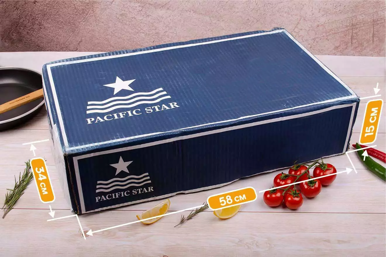 57 см длина филе, вес 1,5 - 2 кг, в коробке 5-10 шт