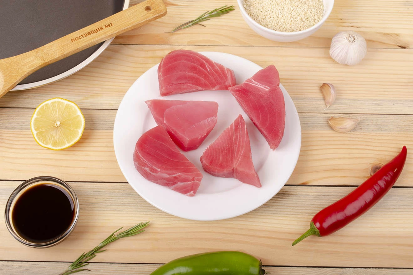 Рекомендации по приготовлению. Стейки тунца подходят для жарки на сковородке, гриле, мангале. Отлично гармонирует с соусами тар-тар, Том Ям, имбирный, а для гарнира подходят обжаренные овощи, томаты, перец, кабачок, баклажан, легкий салат из листьев шпината, рукколы. В сыром виде используется для приготовления сашими, тартара с такими ингредиентами как соевый соус, авокадо, зеленый лук, различные специи, лимон.